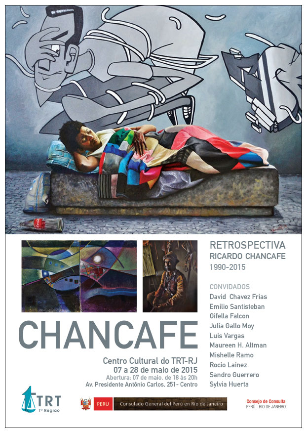 EXPOSICION DEL ARTISTA PLÁSTICO El Consulado General del Perú en Río de Janeiro tiene el agrado de invitarlo a la exposición del artista plástico Ricardo Chancafe- Retrospectiva 1990-2015, donde nuestro compatriota ofrece una retrospectiva de las obras que ha trabajado a lo largo de este tiempo y que ha ordenado en series, distinguibles por su temática, materiales y técnicas empleadas. La muestra es también un encuentro con su periodo de formación, con aquellos con quienes compartió aulas en Bellas Artes, que lo acompañan con diez obras, dando un singular contexto generacional y amical. Lugar: Centro Cultural del TRT – Tribunal Regional do Trabalho - RJ Vea la nota en la Revista Virtual Nativos: Cordialmente Rolando Ruiz Rosas Cateriano