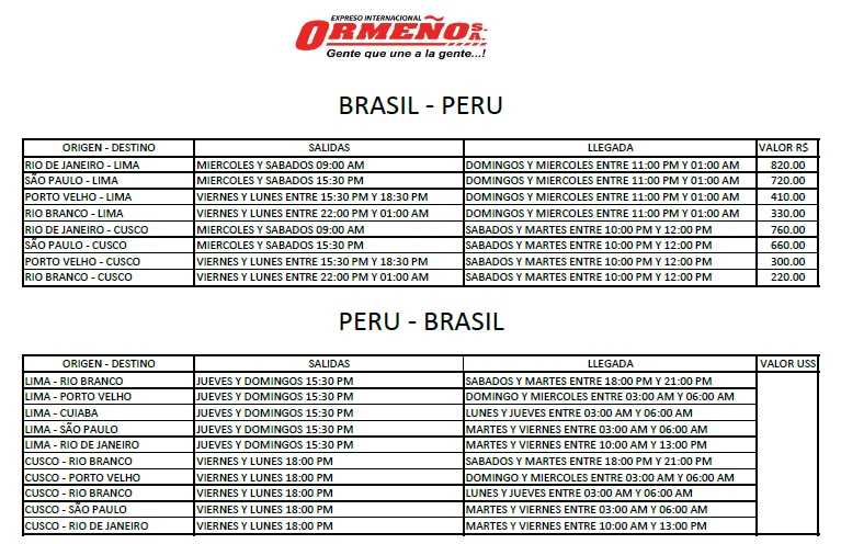 El Consulado General del Perú tiene el agrado de invitar a la comunidad peruana a la inauguración de la exposición Via Interoceánica. Rio-Lima: una ruta a descubrir, que presenta en el terminal rodoviario de Rio de Janeiro 40 imágenes fotográficas sobre la travesía terrestre en la vía que conecta directamente al Brasil con nuestro país. Servicio de omnibus Rio de Janeiro al Perú Asimismo, se cumple con informar que la empresa nacional Expreso Internacional Ormeño ofrece actualmente el servicio de pasajeros Rio de Janeiro - Lima, que sale del terminal rodoviario Novo Rio los días miércoles y sábados a las 9 horas. Dicho servicio comprende igualmente los destinos Puerto Maldonado, Cusco, Abancay, Nasca e Ica, en nuestro país. Mayores detalles en el documento anexo.Compra de pasajes e informes en: Terminal Novo Rio - Av. Francisco Bicalho, 1 Box 50 (Box de la empres Crucero del Norte) - Santo Cristo – Rio de Janeiro Contacto: Claudia o Savio Telf. (21) 99807.4814 Cordialmente Rolando Ruiz Rosas Cateriano