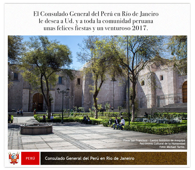 Feriados Navidad y Año Nuevo Se cumple con recordar a la comunidad peruana que el Consulado General del Perú en Río de Janeiro atenderá al público en su horario habitual de 9am a 3pm, de lunes a viernes, incluidos los días viernes 23 y 30 de diciembre y lunes 26 de diciembre de 2016 y 2 de enero de 2017. Estando próximos a concluir el año les deseamos, en nombre propio y en el del personal del Consulado General del Perú en Río de Janeiro, ¡Felices fiestas y un venturoso 2017! Cordialmente Rolando Ruiz Rosas Cateriano